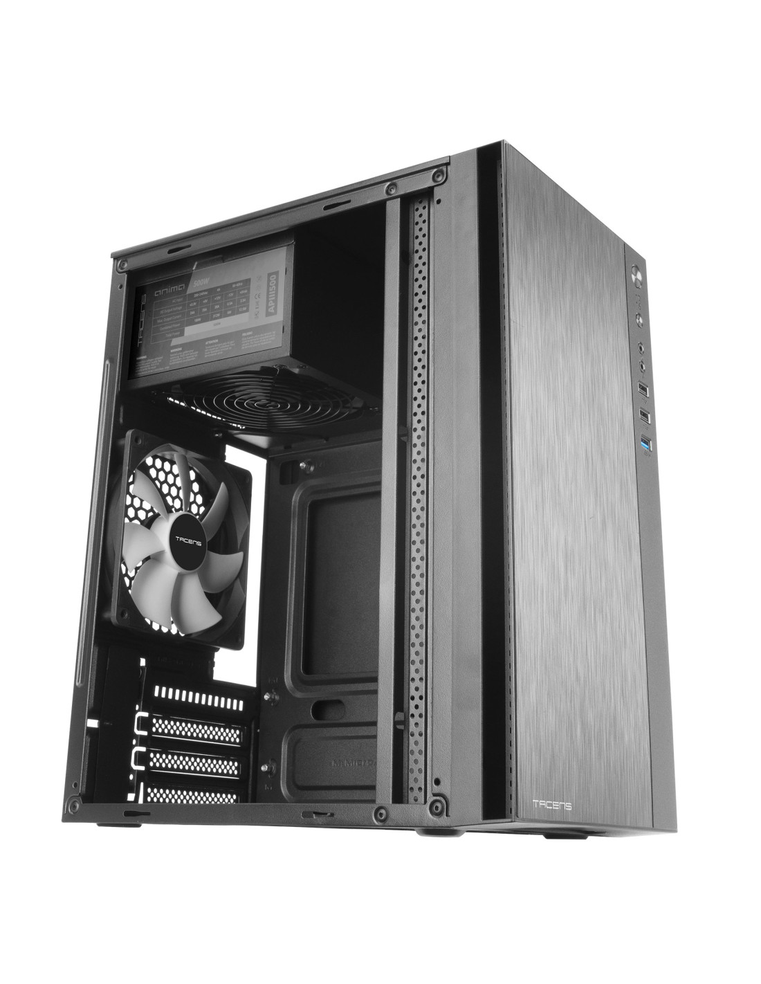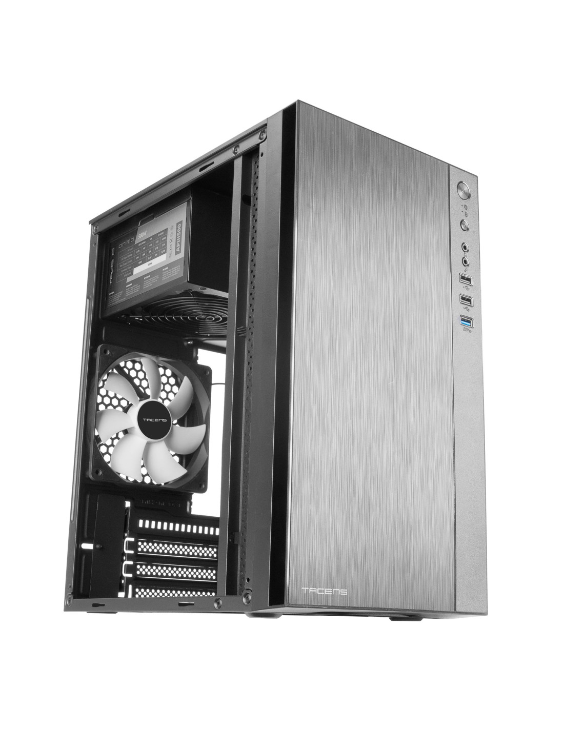 La ACX500 es una caja Premium Micro-ATX / Mini-ITX que incluye una fuente de alimentación de 500W de última generación, equipada con un ventilador ultrasilencioso de 12cm y sistema antivibraciones, garantizando eficiencia energética del 85% y máxima estabilidad. Diseñada para ofrecer un equilibrio perfecto entre funcionalidad avanzada, diseño elegante y refrigeración sobresaliente, este chasis cuenta con un frontal de aluminio pulido y acabado negro profesional, ideal para cualquier entorno. Incorpora un ventilador trasero de 12cm ultrasilencioso y admite hasta 3 ventiladores adicionales de 12cm, refrigeración líquida de 120mm y CPU coolers de hasta 160mm. Su estructura optimizada facilita el montaje y ofrece capacidad para hasta 6 discos duros (4 x 2.5” SSD + 2 x 3.5” HDD), además de total conectividad con puertos USB 3.0, USB 2.0, audio HD y micrófono en el panel frontal.