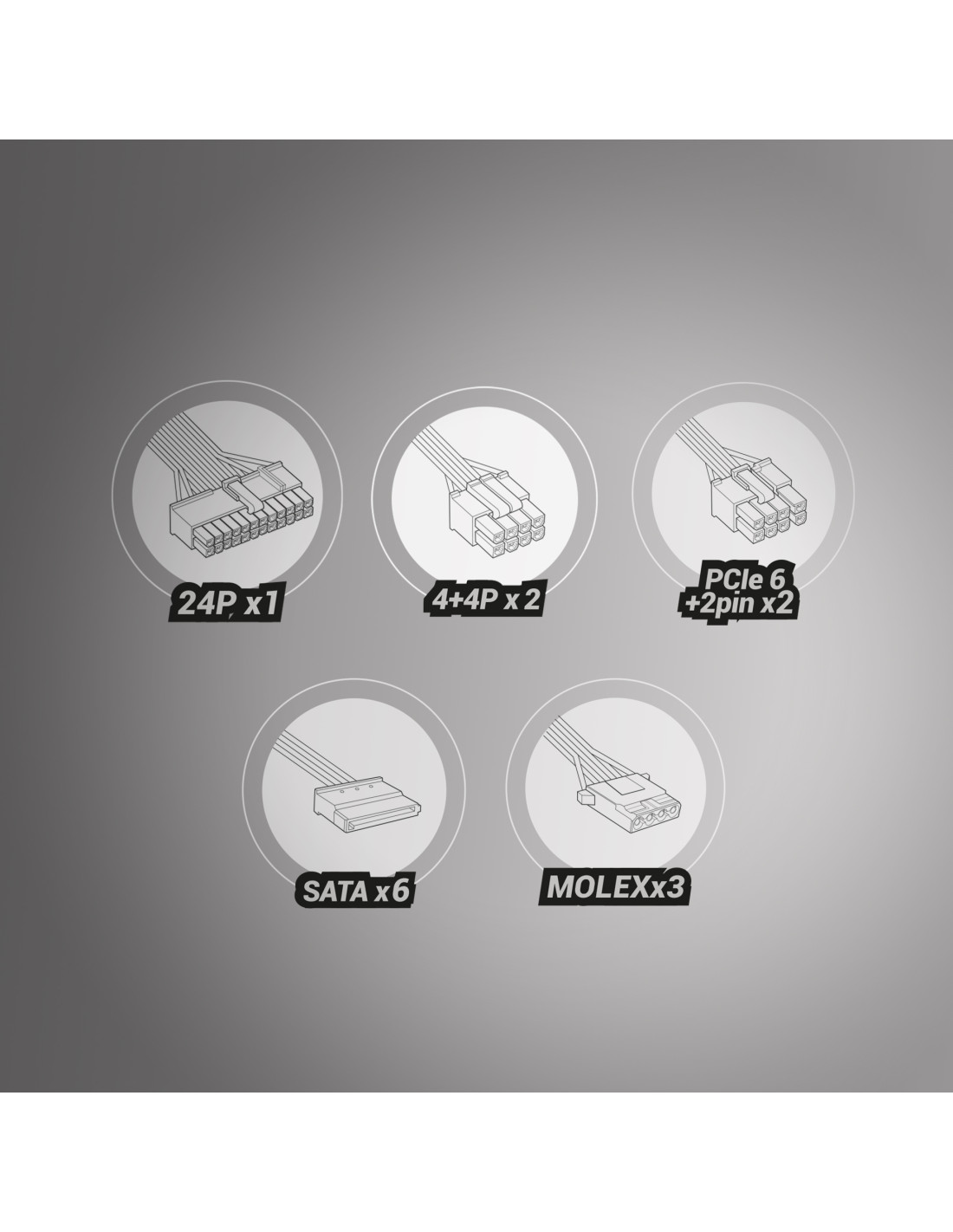 - /1x ATX MB 24 PIN /1x EPS +12V 4+4 PIN /2x PCIe 6+2 PIN /6x SATA /3x Molex 4 PIN