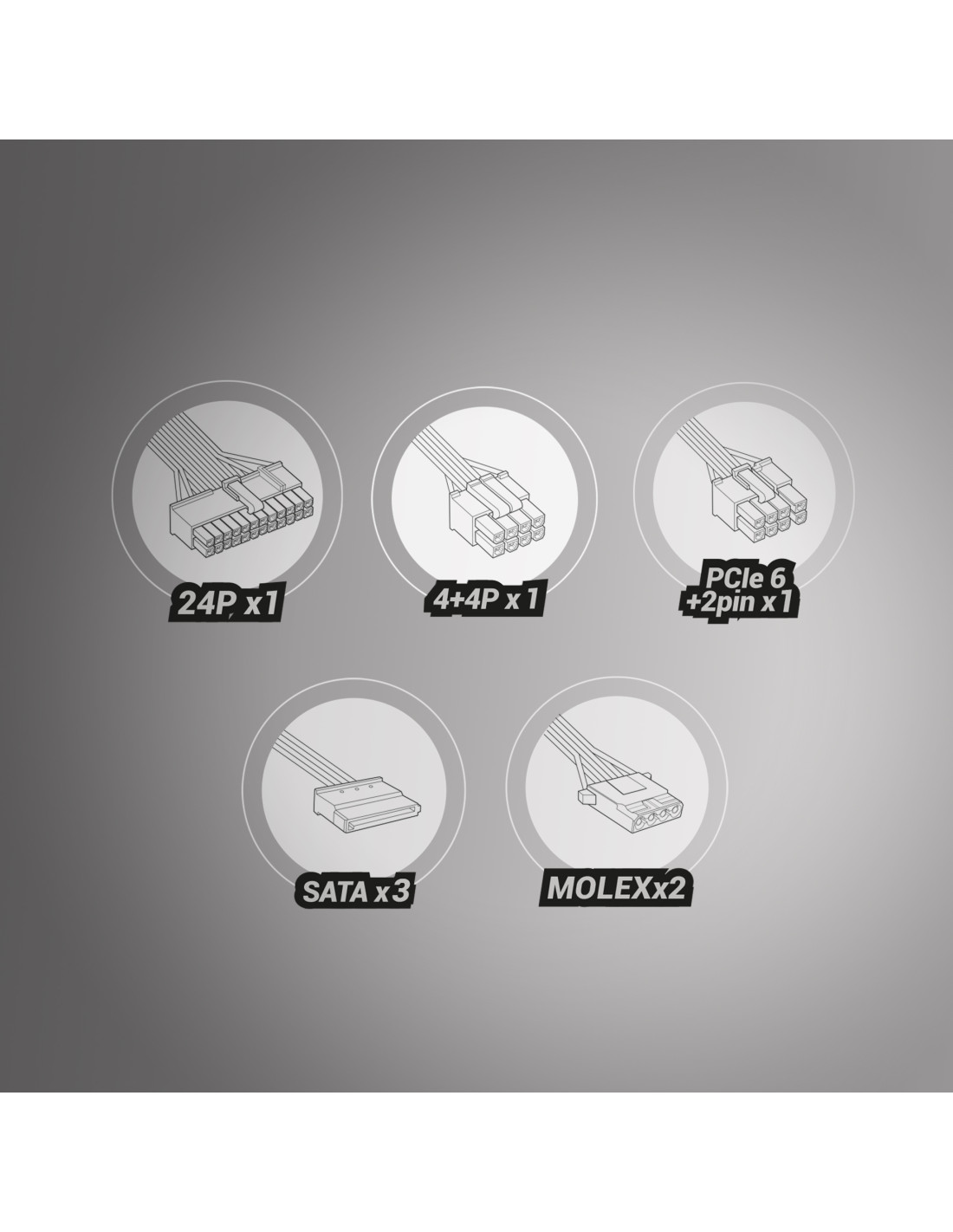 - /1x ATX MB 24 PIN /1x EPS +12V 4+4 PIN /1x PCIe 6+2 PIN /3x SATA /2x Molex 4 PIN