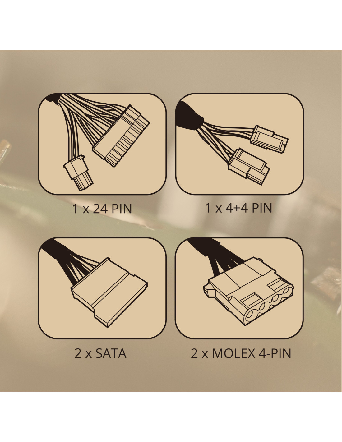 - /1x ATX MB 20+4 PIN /1x EPS +12V 4+4 PIN /2x SATA /2x Molex 4 PIN